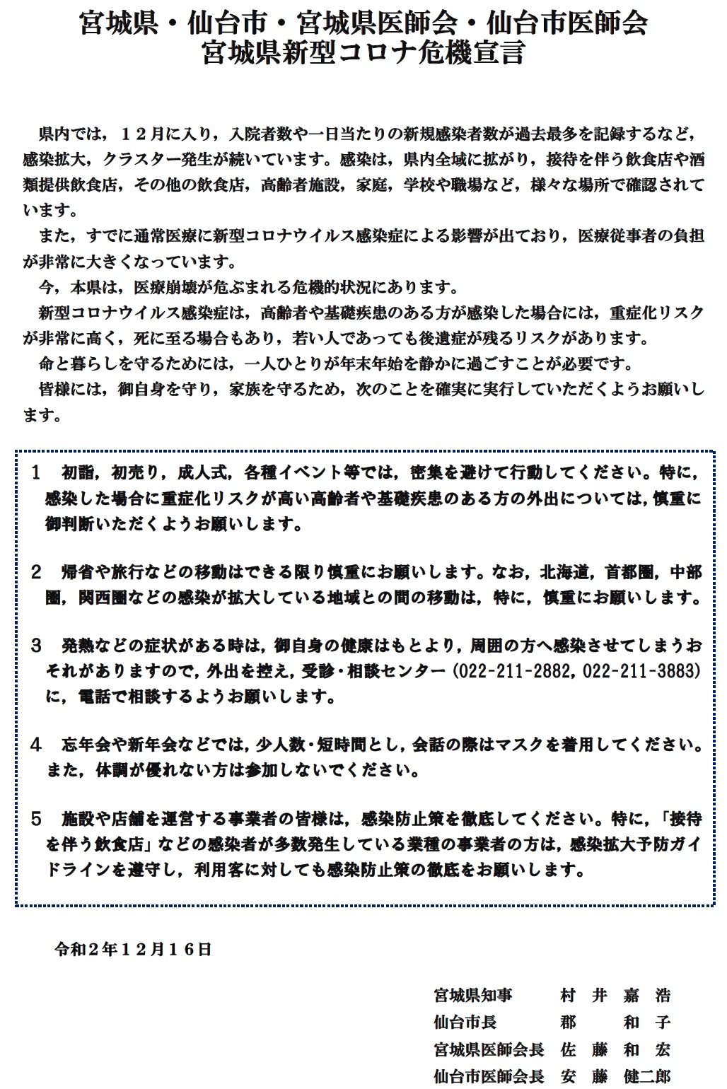 仙台市危機管理局 On Twitter 新型コロナウイルス感染症関連 本日 市内で29人の感染が確認されました 宮城県知事 仙台市長 宮城県 仙台市医師会長の4者で宮城県新型コロナ危機宣言を本日発表しました 命と暮らしを守るため 皆様には年末年始を静かにお過ごし
